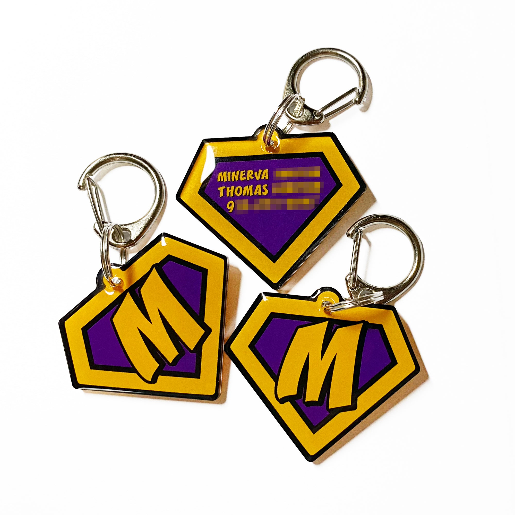 This is a superhero emblem-shape pet id tag, personalized with your pet's initial on the front. Other personalization is to go on the back side of the tag.